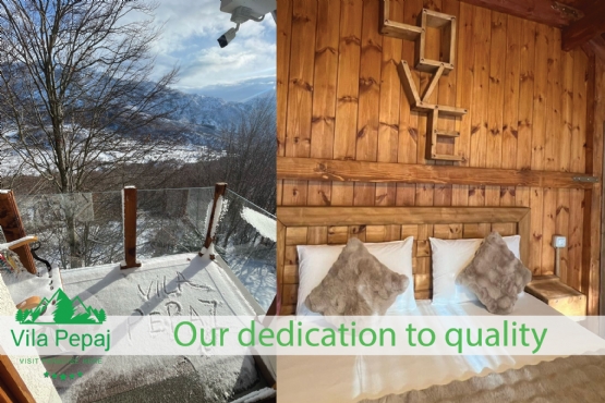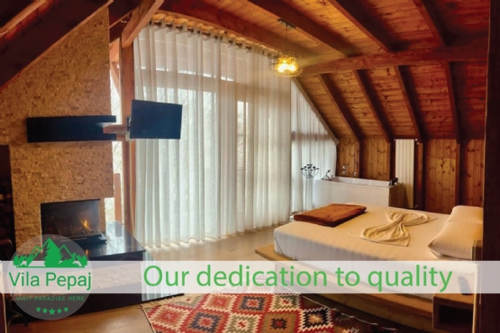 • Vila është e ndërtuar dhe e areduar tërësisht nga druri, që mysafirët tanë të ndihen sa më afër natyrës dhe të shijojnë një kënaqësi dhe rehati që mund të gjejnë vetëm brenda një vile nga druri e ngritur brenda një pylli.