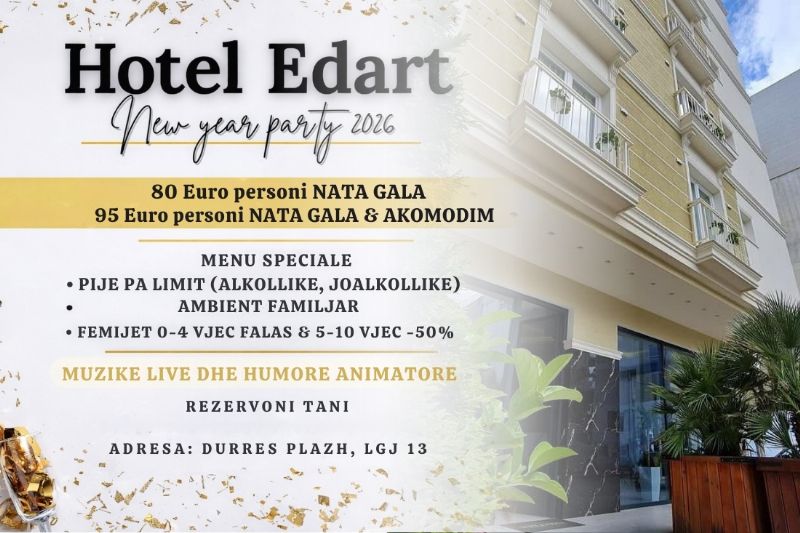 Emri i produktit: Festa e Vitit te Ri te hotel Edart Durres 80€, oferta per darken e vitit te ri 2026, nata gala, nata gala dhe akomodim, menu darka e vitit te ri, oferta per festat e fundvitit, rezervime dark familjare